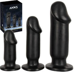 Butt Plug Training Kit van ANOS met 3 buttplugs met verschillende maten en gewichten voor plezierige stimulatie of stretching en training van de anus. Elke flexibele plug heeft een realistisch gevormde eikel en een grote zuignap, waardoor hij veilig (langdurig) kan worden gedragen zonder te ver naar binnen te glijden. De pluggen zijn ook perfect voor handsfree plezier.
