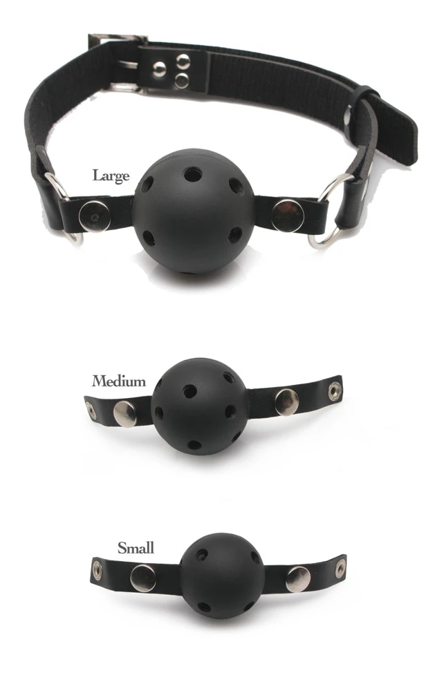 This 4-part ball gag set includes an adjustable head strap and three interchangeable ball gags in sizes S, M and L, making it also an attractive set for people who are experienced with gagging one another. Each ball gag has holes to breathe through. Couples should start with the smallest ball gag and gradually work their way up to the larger gags until they have reached the largest one. The ball gags can be exchanged quick and easy using the press studs on the head strap.