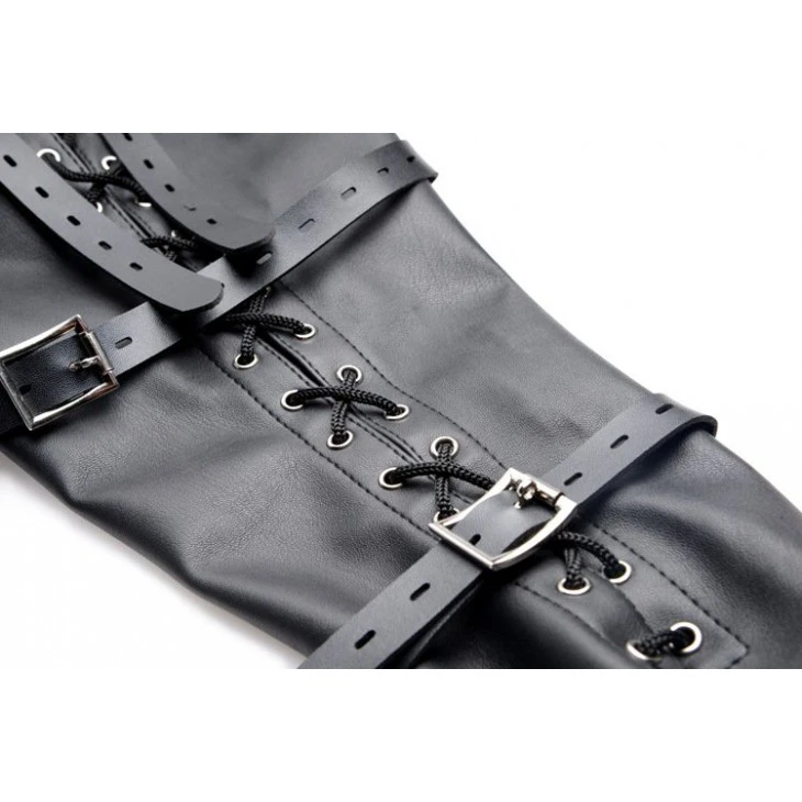 Verdiep de intensiteit van je bondage-spel met een single-glove die je slaaf/slavin hulpeloos zal maken naar jouw wensen! Beperk hun bewegingsvrijheid door hun armen achter hun rug, elk in de monohandschoen te glijden, de veters aan te passen en alle riemen aan te trekken. Afsluitbare gespen geven u de nog meer macht en controle over uw eigendom te versterken. De D-ring aan het uiteinde van de single-glove maakt de bevestiging van gewichten of kettingen of de verbinding met enkelboeien mogelijk. Versterk de sfeer van je volgende scène met een unieke bondage om uw sub nog onderdaniger te maken.