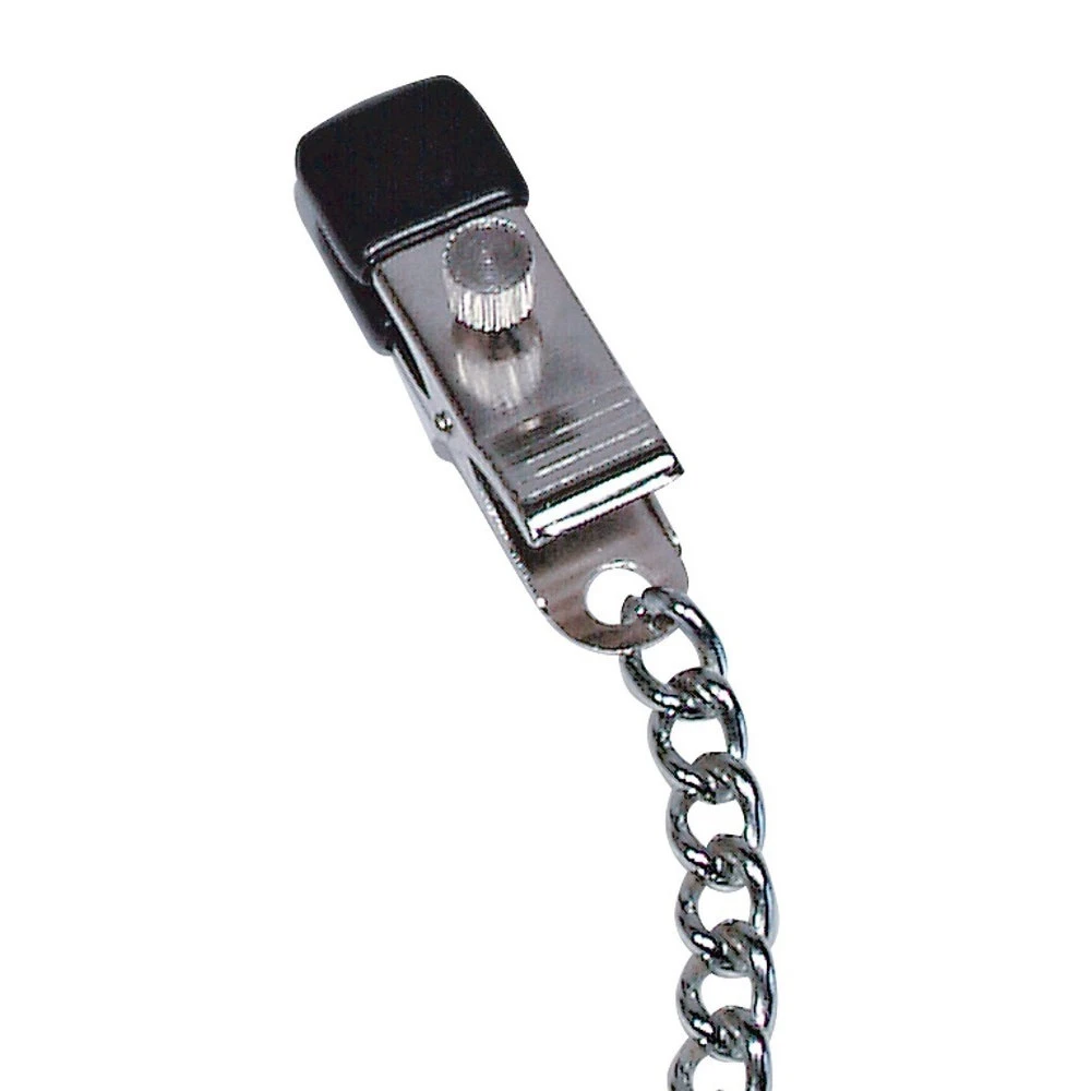 Tepelklemmen met twee 30 cm lange ketting aan de borst. Hele gewicht: ca. 70 g clip: 1,5 cm breed, 5,5 cm lang, kan worden ingesteld intensiteit van druk met schroef klemmen.