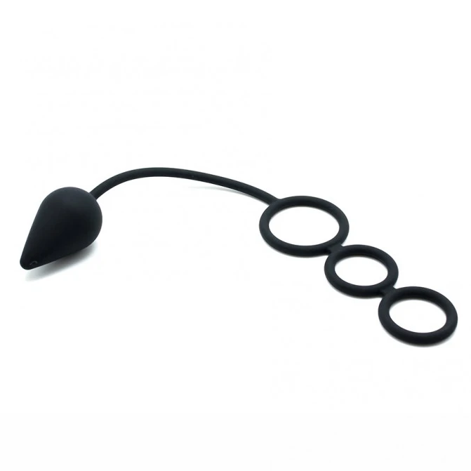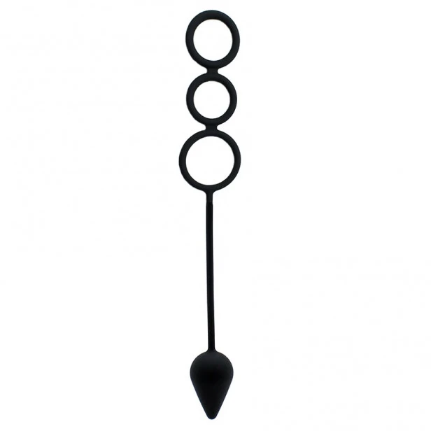 Zwarte siliconen driedubbele cockring met geintegreerde anaal plug. Ideaal opm te dragen tijdens masturbatie of terwijl je jouw partner neukt; de ringen geven jou een keiharde, kloppende erectie en de anale plug stimuleert jouw anus. Verkrijgbaar in twee uitvoeringen: S/M met 4cm Ø anaal plug en M/L met 4,6cm Ø anal plug.