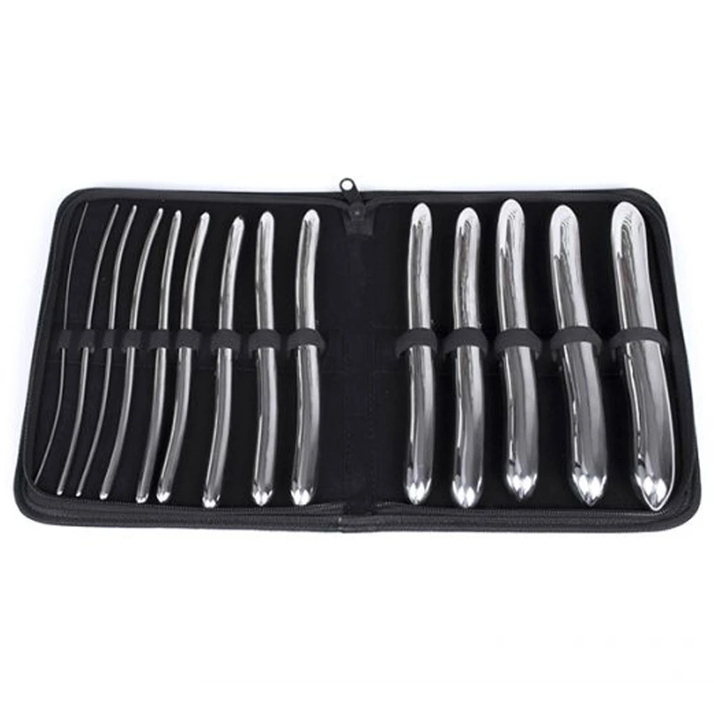 Each chrome plated brass sound in the series is slightly larger than the one before. They are also slightly larger on one end than on the other. This comes to a total of 16 graduated sizes in 14 instruments. Diameters range from just over 3/16 inch to about 1/2 inch in diameter. The original intended medical use for these probes was to dilate the cervix, but they are also used to clear blockages in the urinary tract. The tubes are rounded at each end and they come in a high-quality, zippered black leather case with red velvet lining on the inside. This set of 14 inch probes is made of stainless steel.