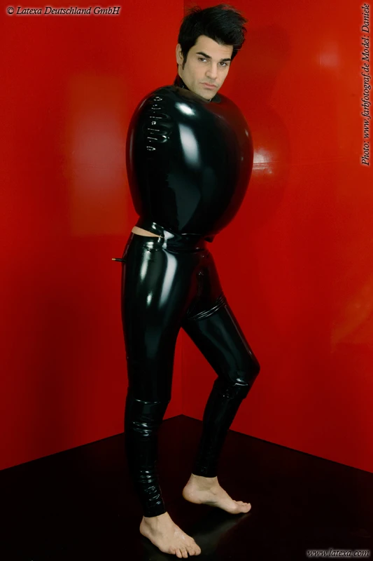 This inflatable Blow-up Latex straight jacket for men, is moulded and glued qualitiy with latex thickness 0,6mm. It has a full lenght back zip and inflates on the sholder