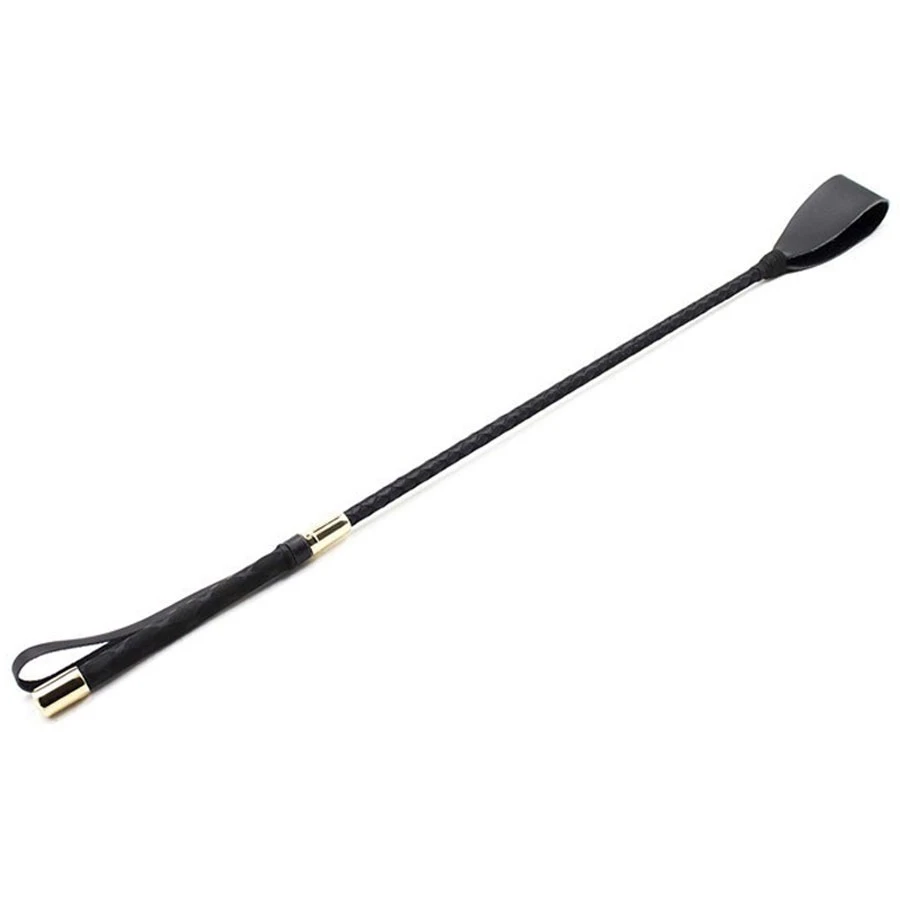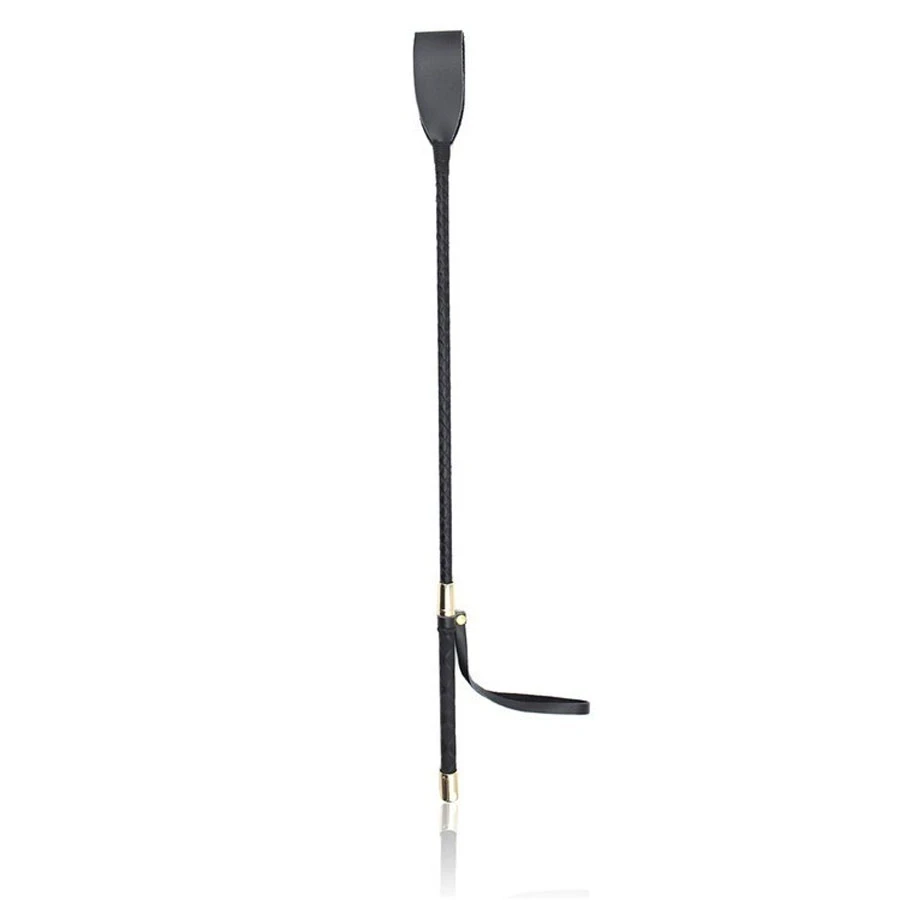 Deze zwarte riding crop is ongeveer 60 cm (26 inches) lang, inclusief een taps uitlopend zwarte uiteinde welke is 35 mm (2.25 inches) breed is. De 17 cm (6.7 inch) fraaie handgreep is voorzien van hoogglansenden goudkleurige stalen uiteinden. Weer zo een prachtprodukt uit Amerika.