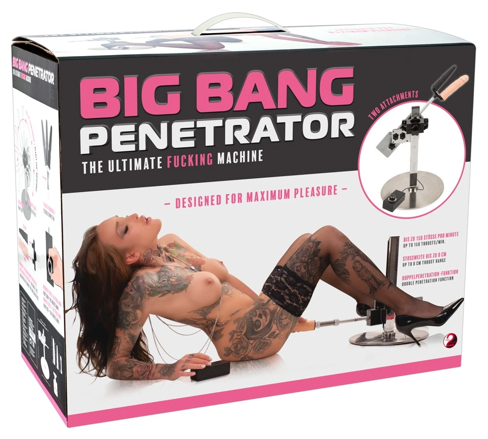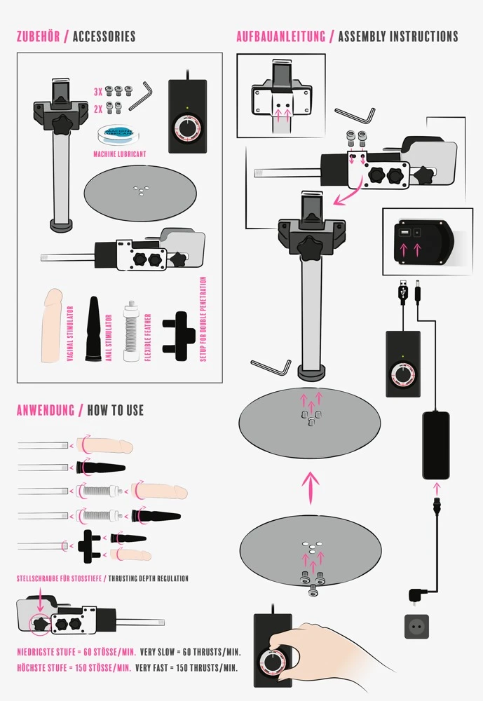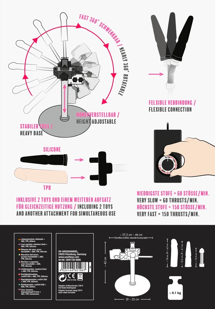 Sex machine met verstelbare standaard en twee opzetstukken. Kan met met een afstandbediening bediend worden en kan tot wel 360° gedraaid worden. Specifiek ontworpen om hands-free te gebruiken. Met 2 meter lange stroomkabel en mains plug. Inclusief opzetstuk voor dubbele penetratie!