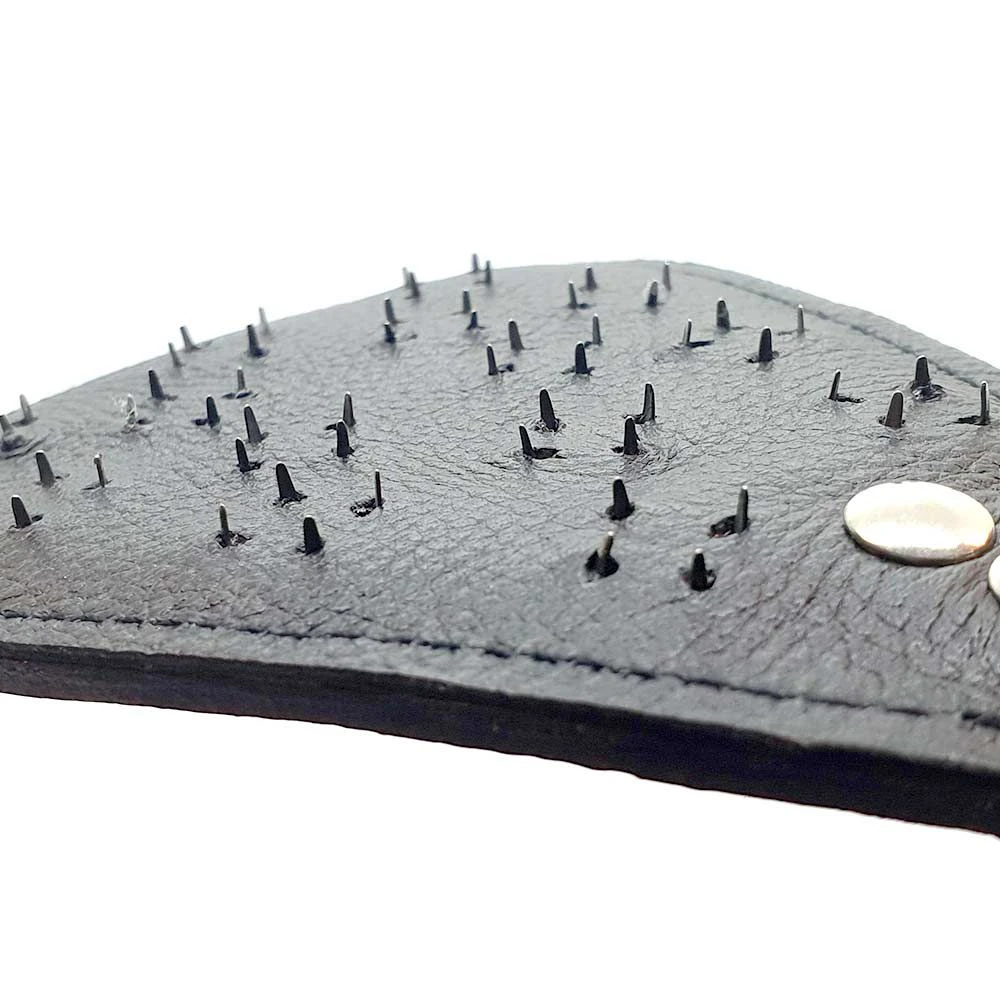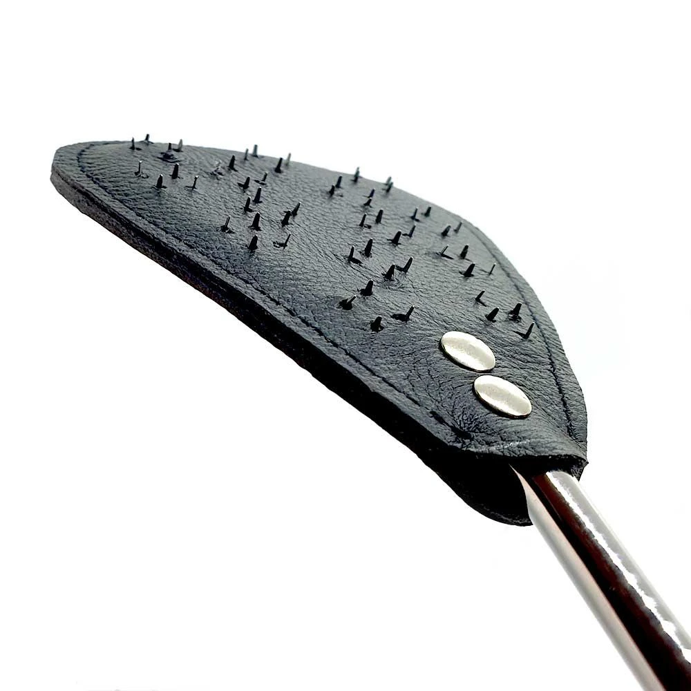 Het venijn van deze rijzweep zit hem in de leren flap aan het uiteinde. Aan de ene kant is deze gewoon glad, maar aan de andere kant is hij bezet met metalen puntjes die behoorlijk scherp zijn – zelfs zo scherp, dat ze de huid kunnen doorprikken (zij het oppervlakkig).