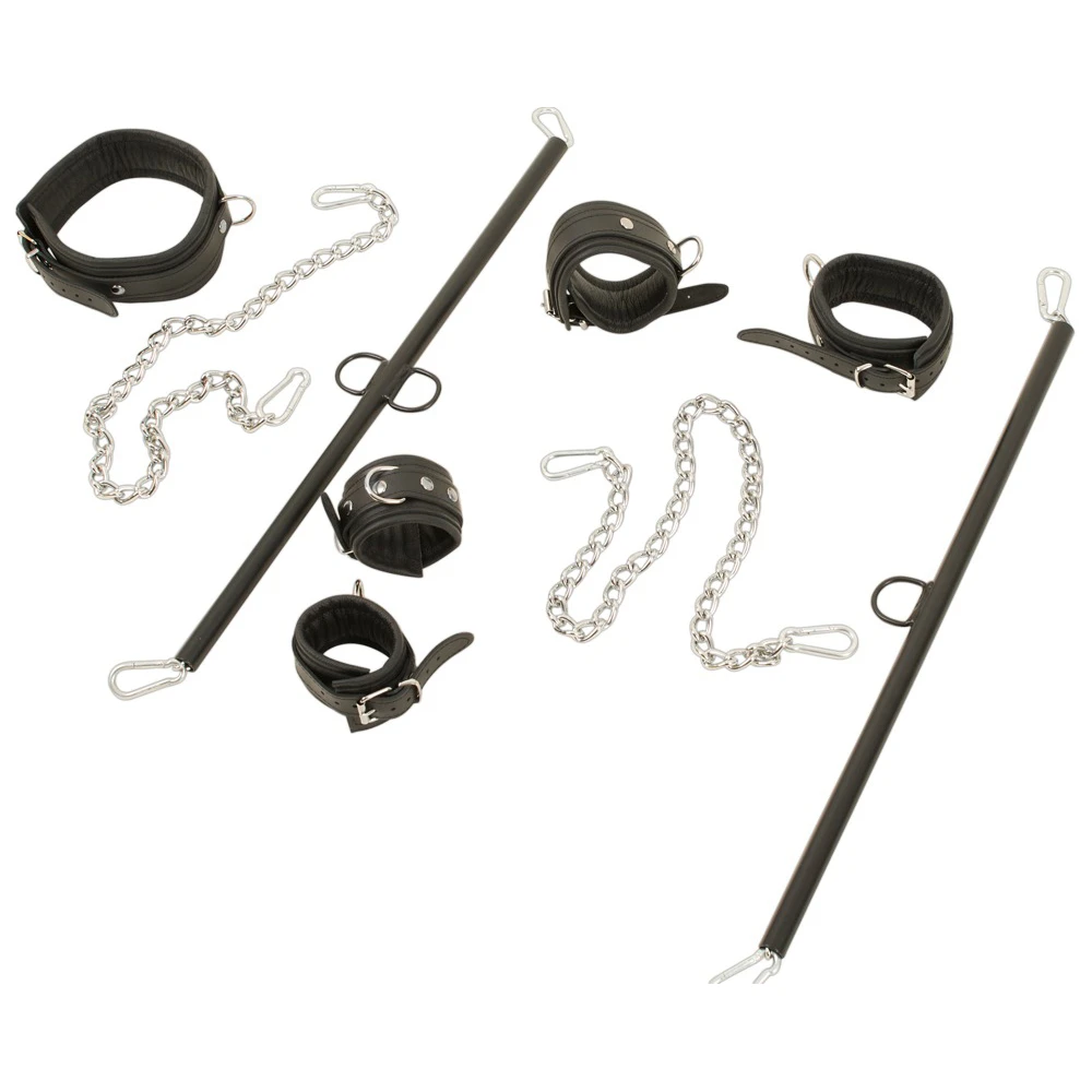 Deze 9-delige set met spreader bars, lederen boeien en kettingen met karabijnhaken maken het voor een ongelofelijke prijs mogelijk voor iedere Dominant in de dop hun gewillige partner onder complete controle te houden. Een ideale manier om uw BDSM collectie te beginnen of om uw bestaande kinky speelruimte uit te breiden!