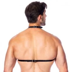 Beha gemaakt van split leder met tepelbedekkers met spijkers aan de binnenzijde. De riem sluit met een metalen gesp en heeft 9 gaatjes. Deze riem is verstelbaar van 86 tot 114 cm. Deze beha is ook door vrouwen te dragen.