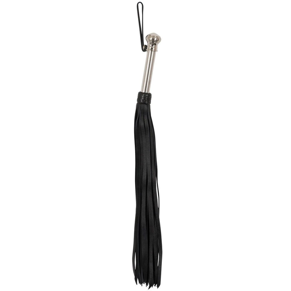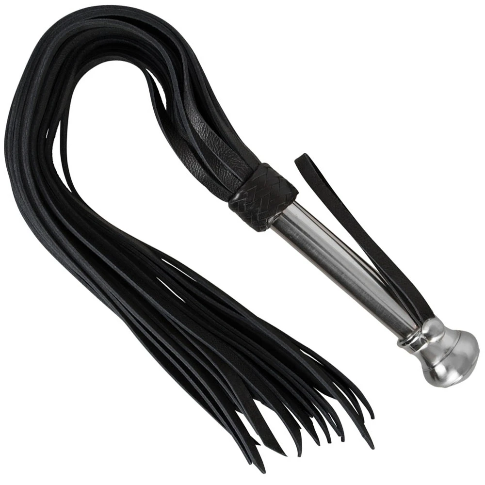 Laat zien wie de baas is met deze zware (569 gr.) zwart lederen flogger met gepolijst RVS handgreep.