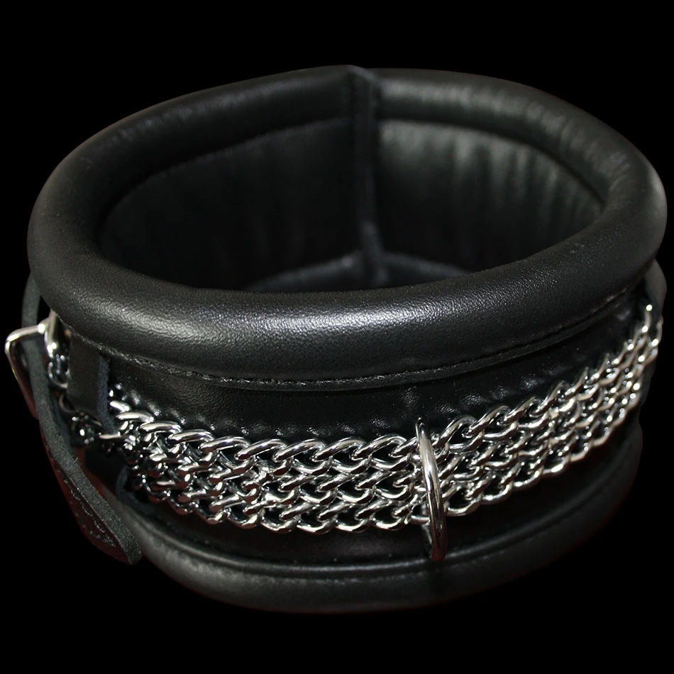 Zeer comfortabele luxe stevige rundlederen Collar met comfortabele zachte nappalederen voering en geen metalen delen aan de binnenzijde. Voorzien van stevige D-ring. Vervaardigd van de allerbeste kwaliteit leder, gedecoreerd met 3 aan elkaar verbonden glanzende metalen kettingen.