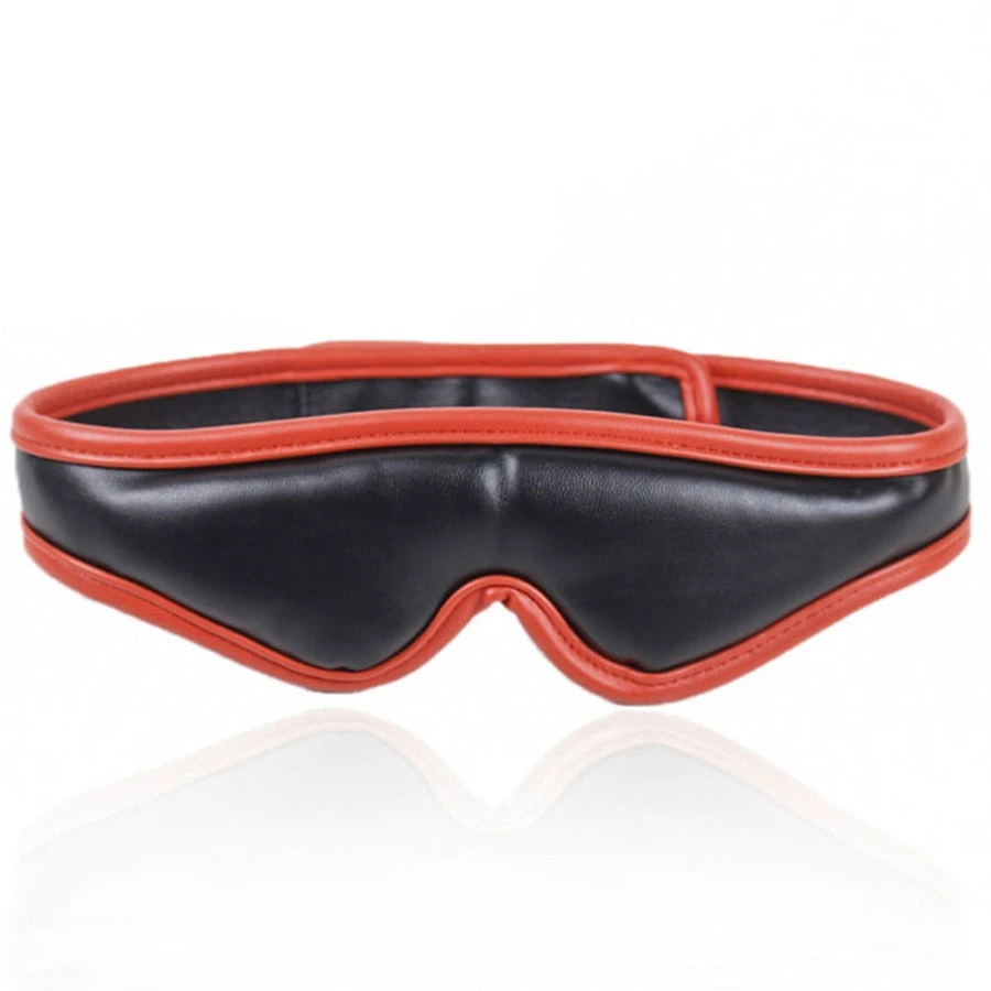 Comfortabele imitatielederen zwart/rode blinddoek met lange klittenband sluiting om gemakkelijk de perfecte pasvorm te maken. De dikke, zachte voering verzekert dat de drager compleet wordt geblindeerd.