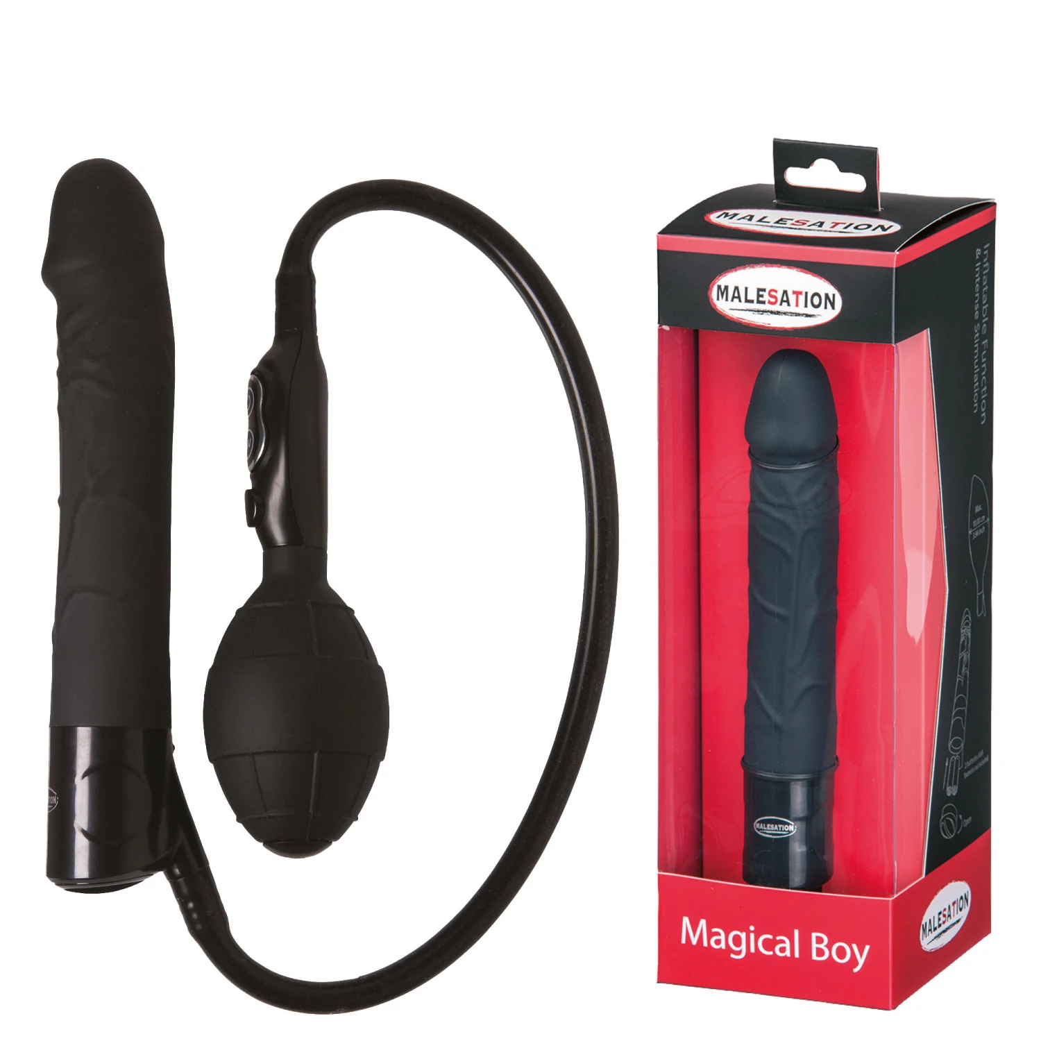 Inflatable vibrating penis with air release and 7 powerful functions, waterproof. Expand to more than double the size. Made of silicone, TPE and ABS plastic. Requires 2 AAA batteries (not included). Length: approx. 15,5cm, Ø approx. 3,3cm. Expansion maximum 10cm.