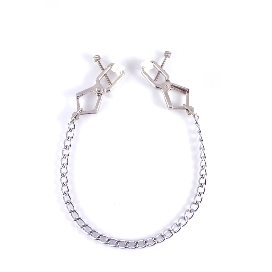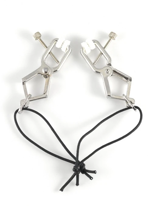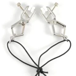 Verstelbare tepelklemmen (paar) met 33 cm lange ketting. Door de zacht rubberen dopjes met reliëf blijven de klemmetjes perfect op de tepels (of schaamlippen, balzak, etc.) zitten. Stevige grip, maar met de verstelbare draaiknop is de druk ook te verminderen.
