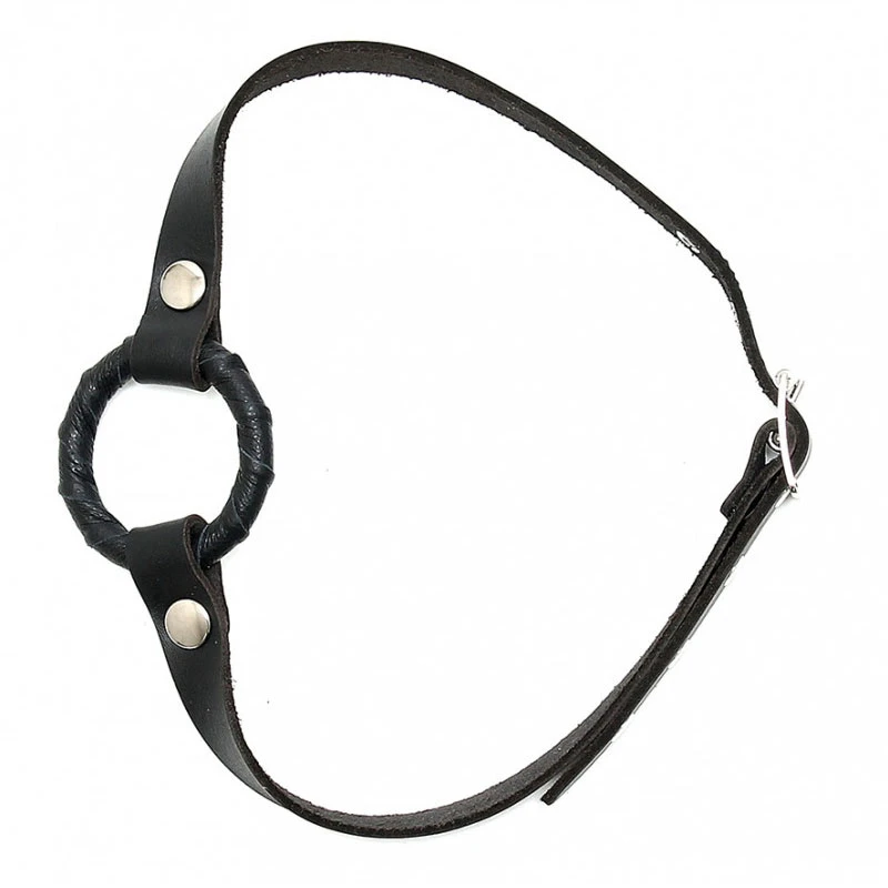 Rimba Bondage Play echt lederen mondknevel met ring. De metalen ring is met nappa leder bekleed en heeft een binnendiameter van Ø 37 mm en buitendiameter Ø 52 mm. Deze mondknevel is verstelbaar over 7 posities, de riem is 1.5 cm breed en sluit aan de achterzijde met een metalen gesp.