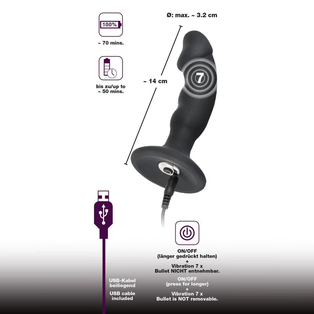 Zwarte siliconen anaal plug voor vrouwen én heren die hun P-spot willen stimuleren! Ook uitermate geschikt voor vaginale penetratie. Licht flexibel, met golvende schacht en voorzien van heerlijk zachte rondingen, met 7vibratiemodussen. Oplaadbaar met de inbegrepen USB kabel. Totale legte 14cm, Ø 3,2cm, siliconen met PU coating.