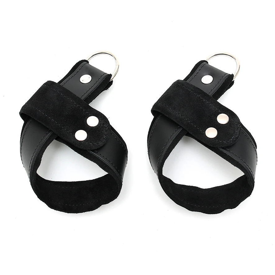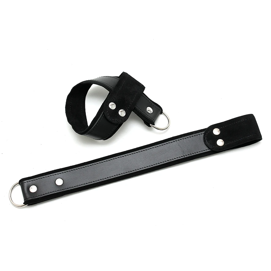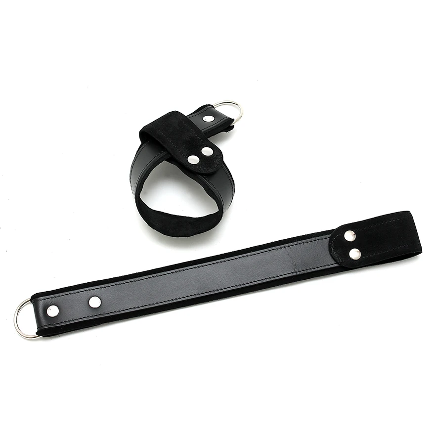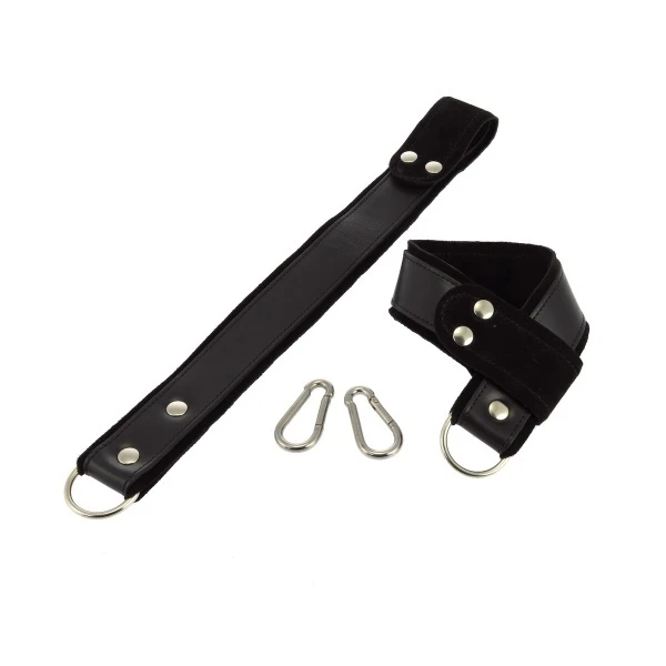 Rimba Bondage Play. Echt lederen handboeien in lus-vorm om te hangen, geleverd met 2 karabijn haken.