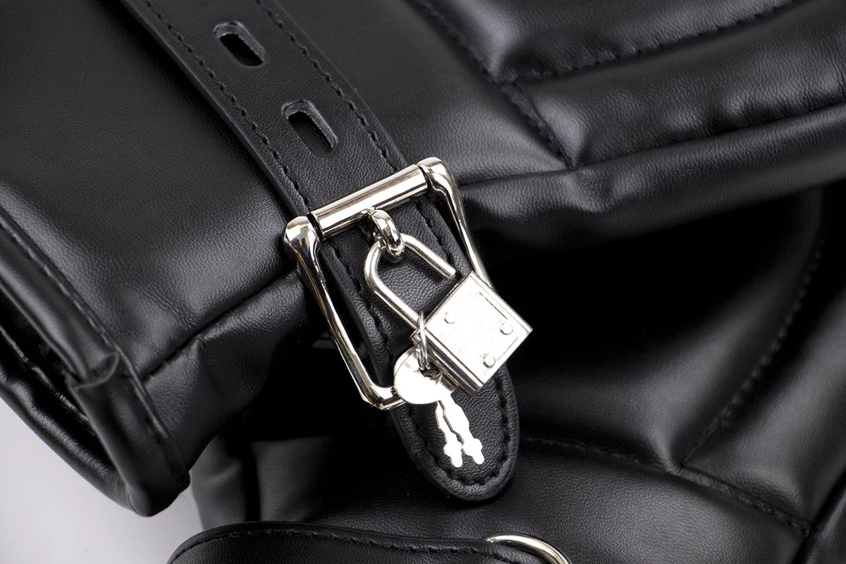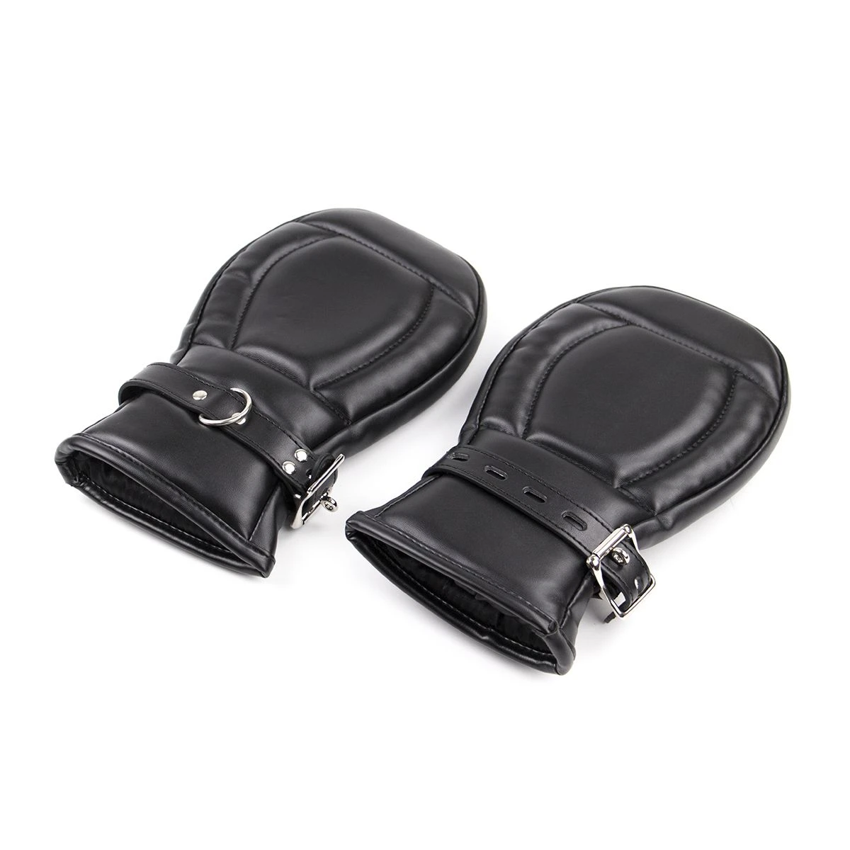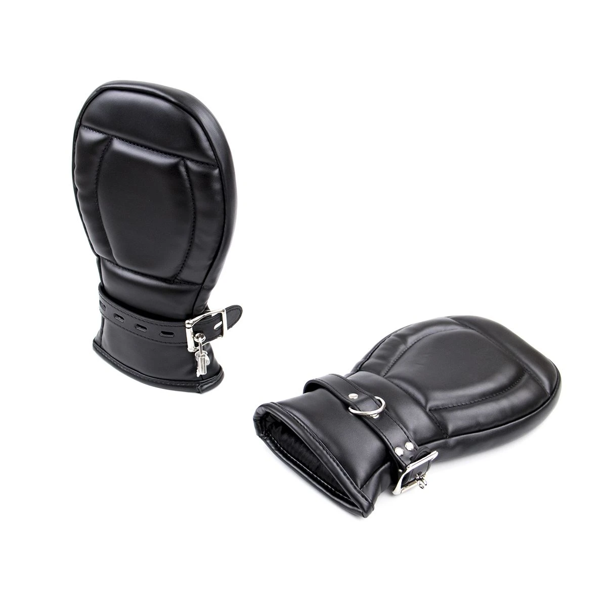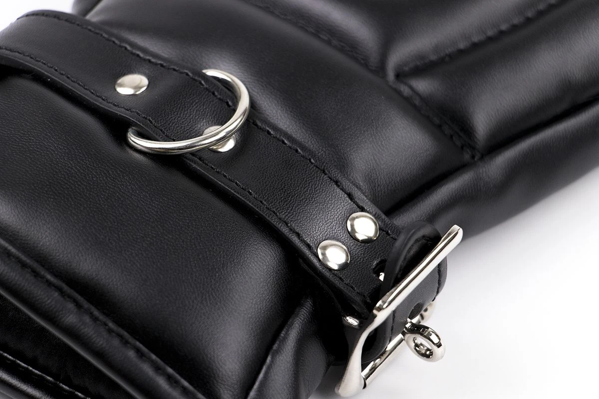 Afsluitbare gewatteerde imitatielederen bondagehandschoenen. U bent als een poes zonder nagels wanneer uw handen achter slot en grendel zitten in deze met satijn gevoerde handschoenen. Met de bijgeleverde sloten kunt u de handschoen vergrendelen, zodat de handen niet meer gebruikt kunnen worden.