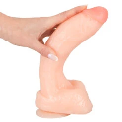 Huidkleurige natuurlijke penis / dildo met een dikke roze eikel, aderen en testikels voor een oppervlaktestructuur die intens stimulerend is. Aangenaam flexibel en voorzien van een zuignap. Perfect voor allerlei soorten wilde liefdesspellen!