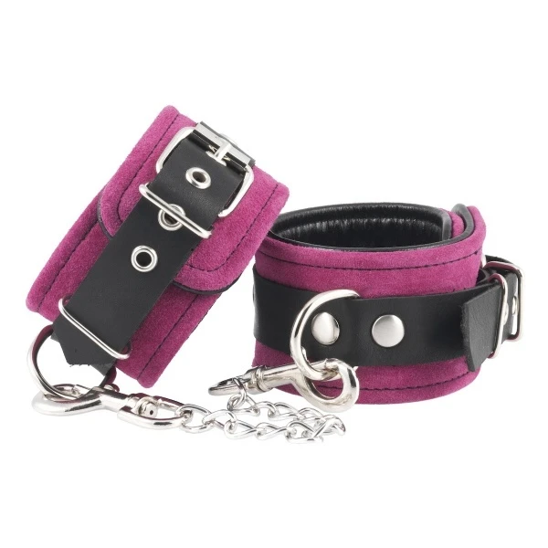 Echt lederen handboeien in zwart met roze suede leer aan de buitenkant.