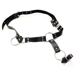 Brede lederen riem met geintegreerde O-ring en cockstrap. Stevige metalen D-ringen sieren beide zijden.