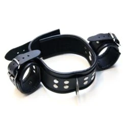 Een mooi lederen halsband met zachte voering langs de randen, stoere studs, een stevige D-ring aan de voorkant en het beste van alles: twee bevestigde handboeien!