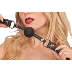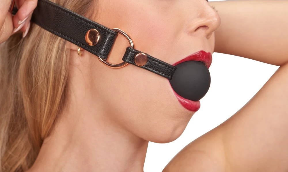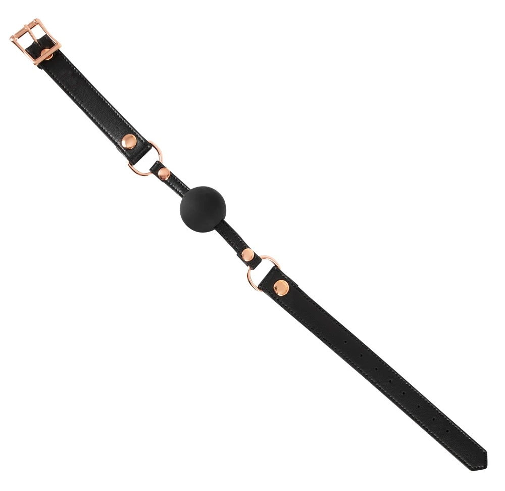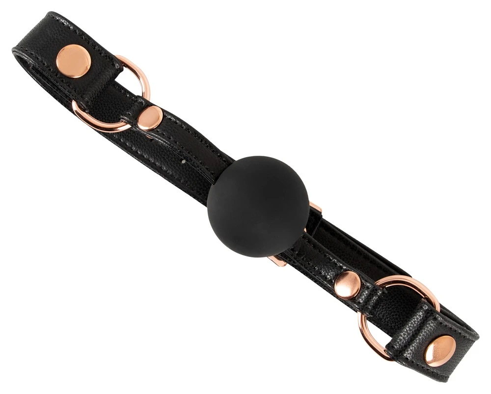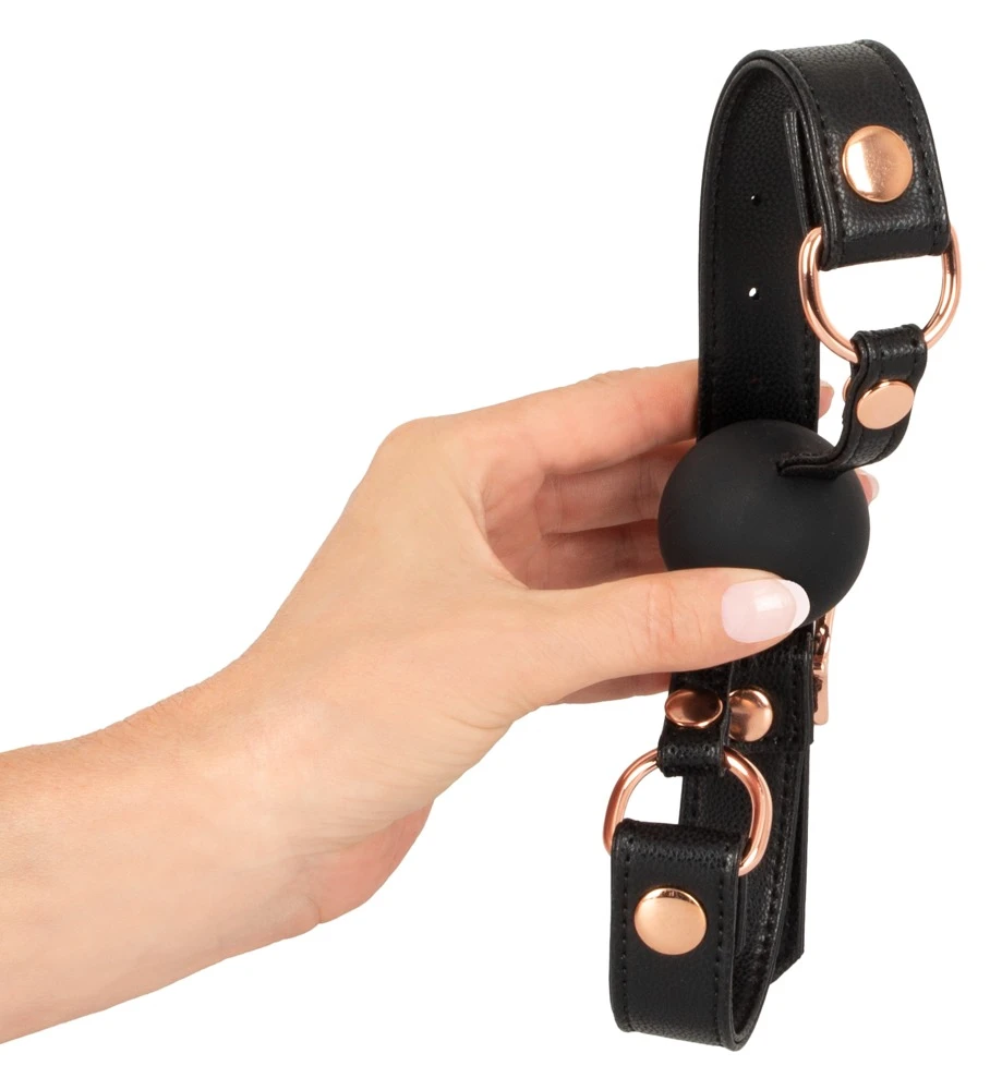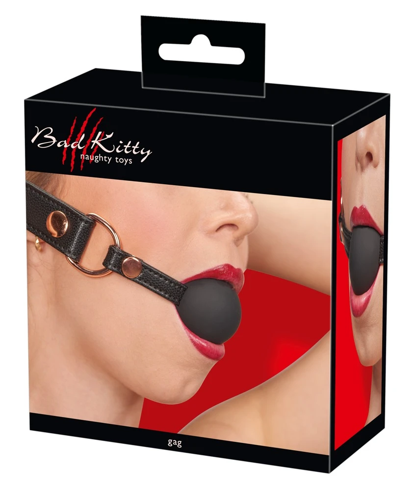 Deze gag van Bad Kitty is het perfecte accessoire voor games van passie en onderwerping. Een harde, ronde, siliconen gag (Ø 4 cm) op hoofdbanden in hoogwaardige lederlook met roségoudkleurige metalen decoratie. Er is pluche aan de binnenkant van de banden en een gespsluiting zodat de riempjes kunnen worden aangepast aan zijn/haar hoofdomvang. Zwart.