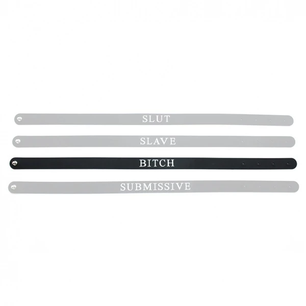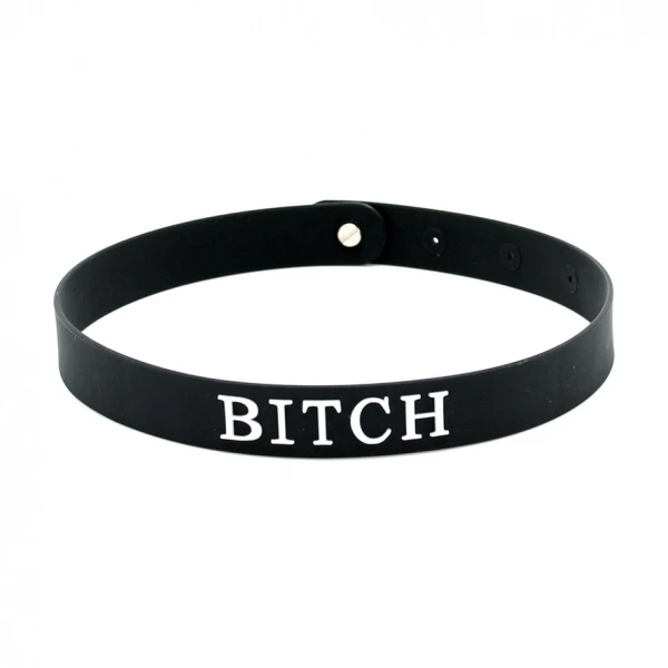 Verras uw onderdanige met deze hoge kwaliteit siliconen halsband. Deze comfortabele siliconen halsband is verstelbaar, om een goede pasvorm te garanderen. De halsband maakt de uiteindelijke verklaring, met het woord BITCH op de voorkant in verhoogde witte siliconen letters. Verstelbare drukknopsluiting in de rug.