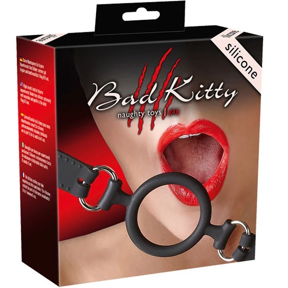 Zwarte O-ring gag met verstelbare bandjes. De ring is stug genoeg om de mond open te houden