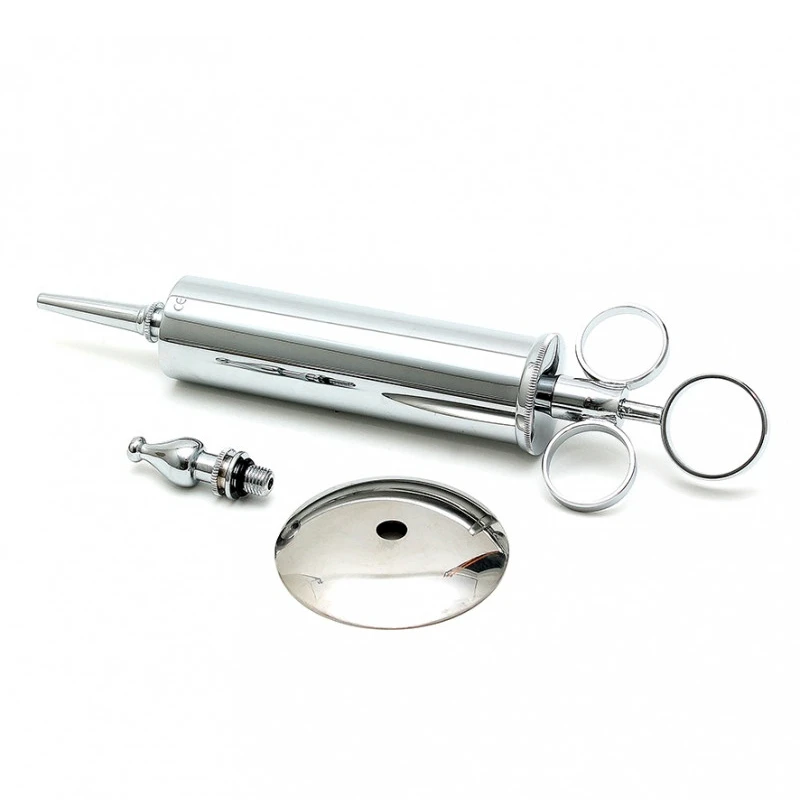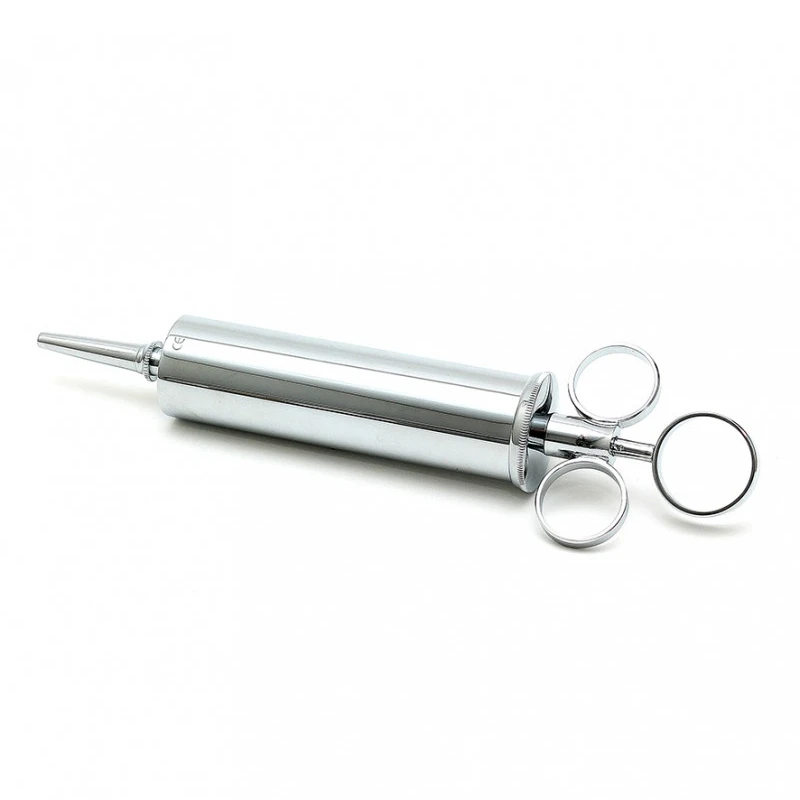 100cc stalen spuit, ideaal voor klysma’s, medical fetisj en BDSM. Gemaakt van koud, meedogenloos ogend staal, dit strenge medische instrument zal zeker uw sub of patient de angst om het hart te laten slaan!